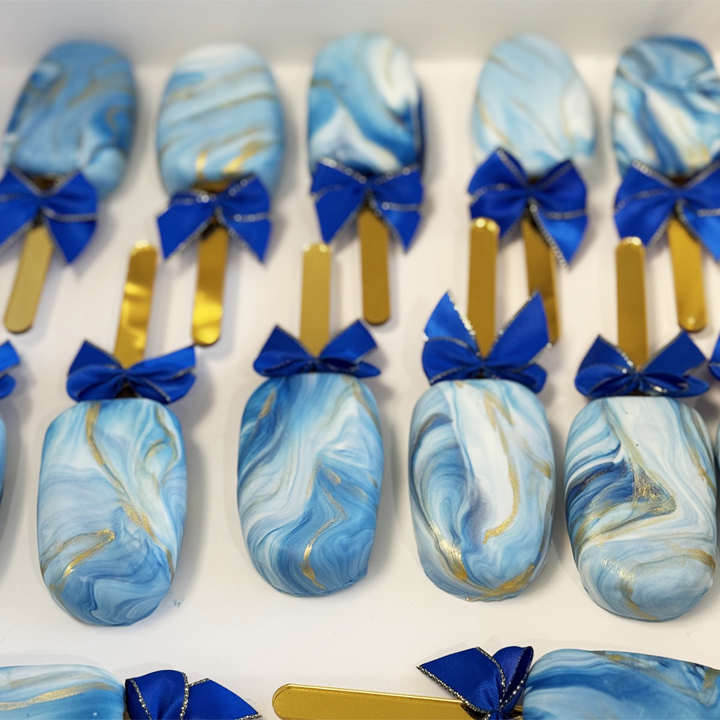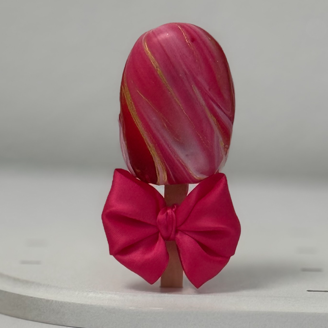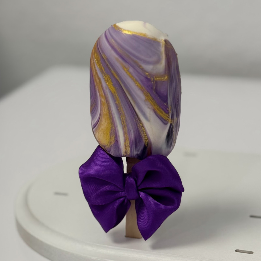 Pamper your tastebuds with our delightful handcrafted Cakesicles, where every bite is a celebration of Rich flavors and artful design. These whimsical treats are tasty cake elegantly coated in a luscious chocolate shell. Perfect for any occasion, cakesicles offer a playful twist on a classic dessert, bringing joy and sweetness to your special moments. The special treats are uniquely marbled and then highlighted with silver or gold toned edible shine. We finish their polished look, with a gorgeous satin bow on the handle. If a marbled look is not your cup of tea, you can choose to have these delicious treats dipped and drizzled in chocolate and enhanced with sprinkles, a dusting of edible glitter, and an edible chocolate bow for that sophisticated Coquette appeal. No matter which look you choose your treats will have 2 alternating color choices for the satin bows on the handle creating an unforgettable and decadent dessert.