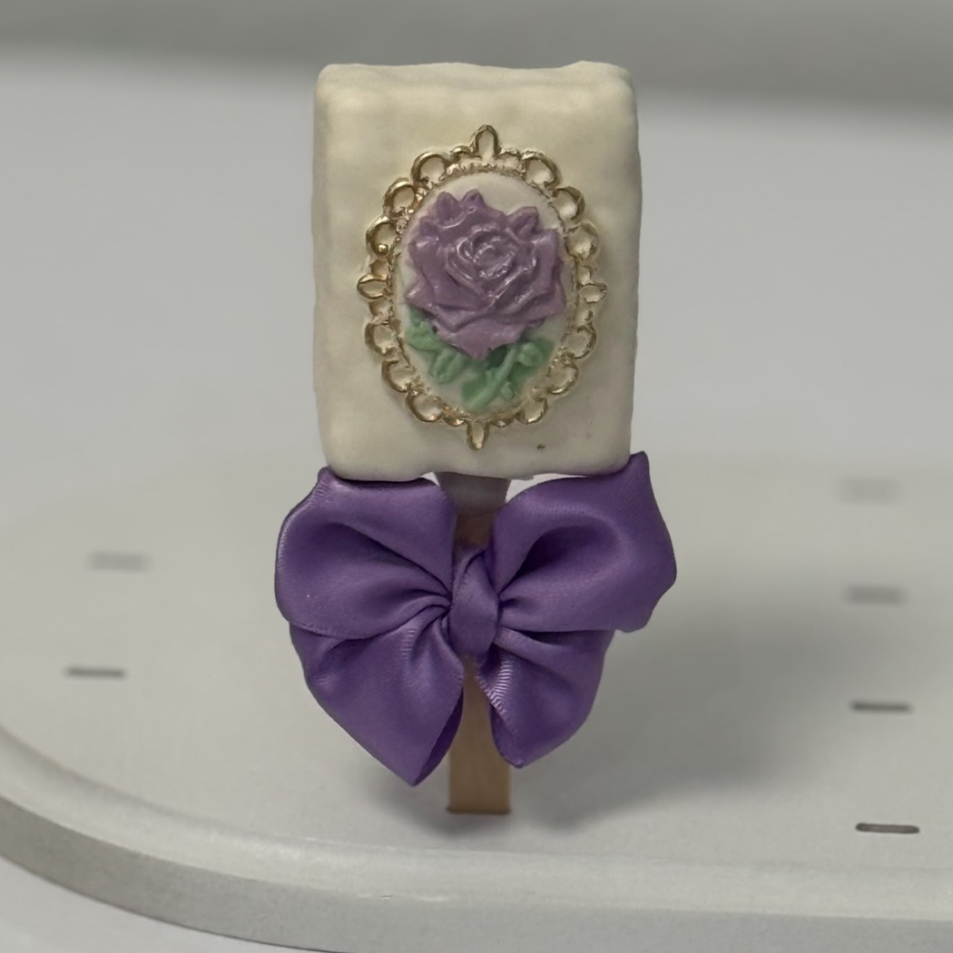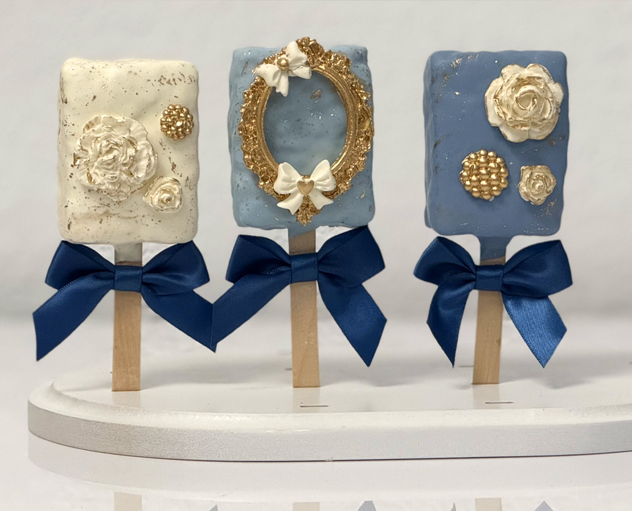 Experience the irresistible taste of Kelly’s Confections chocolate dipped rice crispy treats. Each tasty bar combines the nostalgic texture of golden rice treats, and a luscious layer of premium chocolate, for a velvety blend of luxurious design and delicious flavor. These classy treats are designed with the chocolate color of your choosing and enhanced with Chocolate drizzle and high-quality sprinkles. They are then dusted with edible glitter to add the right amount of sparkle and charm. Every rice crispy treat is lavishly embellished with a beautiful satin bow on the handle of every stick. These gorgeous little sweet treats have the option of being marbled and enhanced with a gold highlighting shine. These exquisite treats will light up the room at your special event or on the face of that special someone.